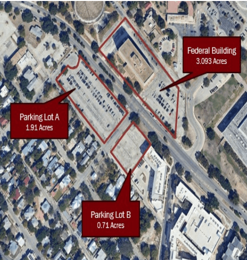 That includes a federally owned office building in the Hemisfair area and federally owned parking lots on either side of César Chávez Boulevard.