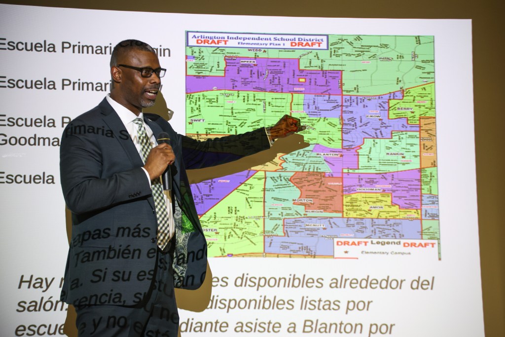 Michael Hill, Arlington ISD chief operations officer, helps Blanton Elementary School parents attending a Jan. 14 school closure meeting understand a map highlighting which zones will possibly be moved to one of four schools. (Christine Vo | Fort Worth Report)