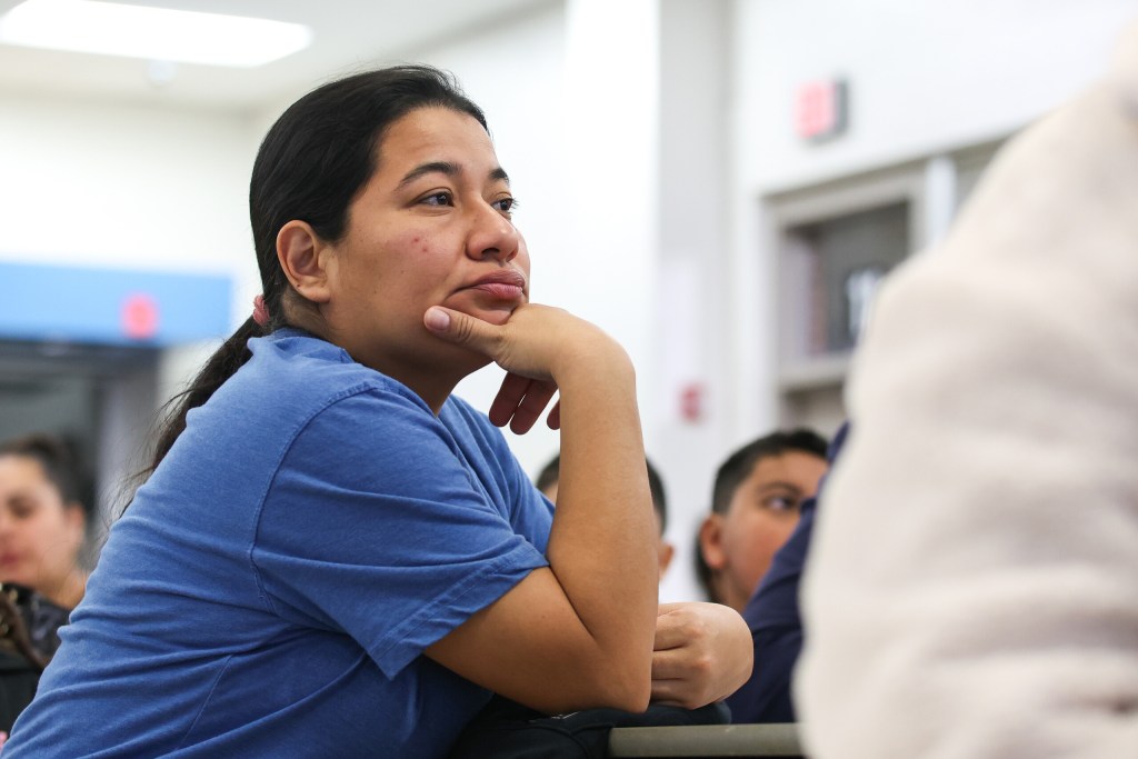 Arlington ISD mother Silvia Rivera listens to the school closure meeting Jan. 14 at Blanton Elementary School in Arlington. With two students attending the school, Rivera said she felt confused at the news but wants what is best for her kids. (Christine Vo | Fort Worth Report)