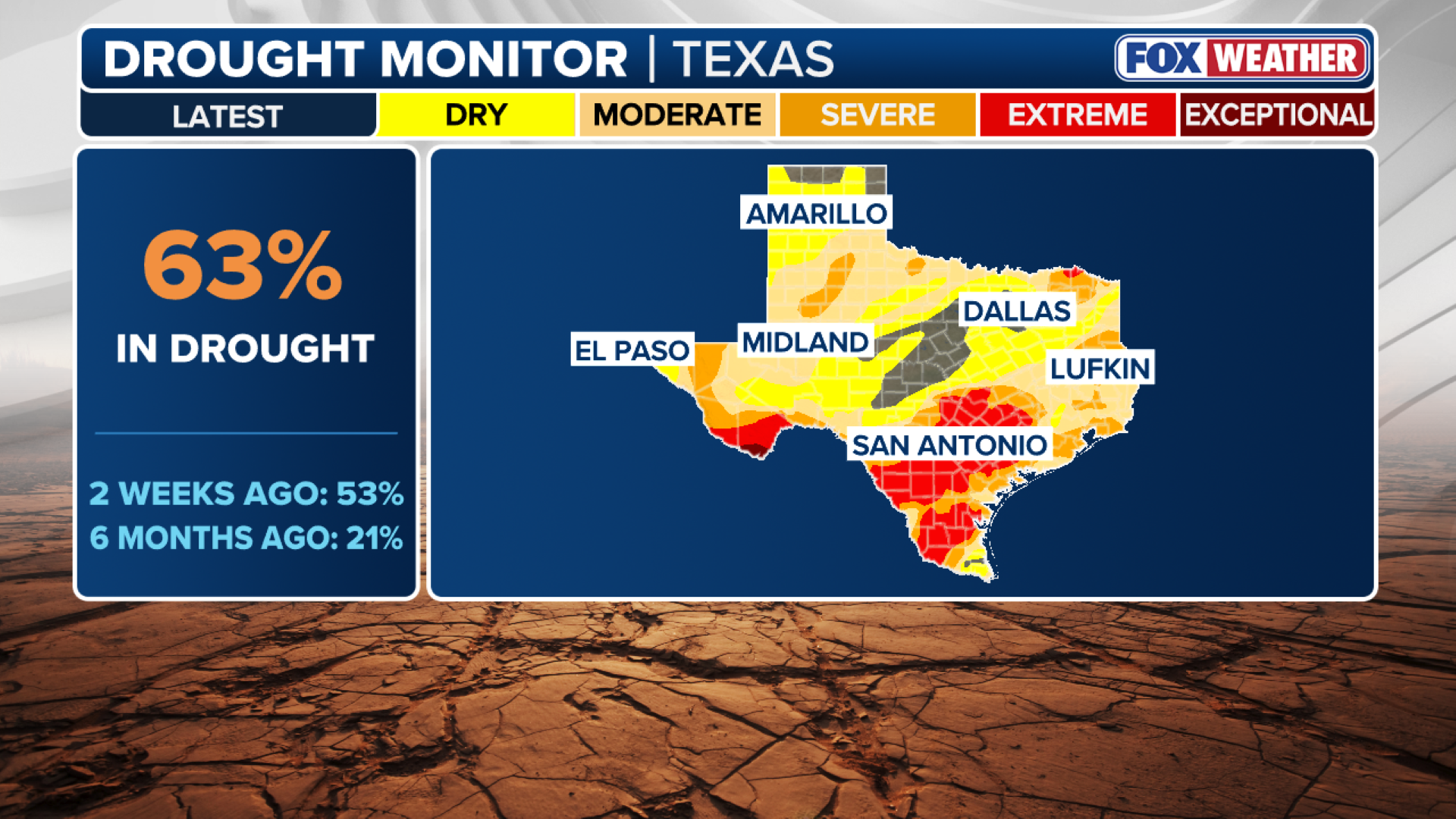 More than 60% of Texas is experiencing some level of drought, according to the U.S. Drought Monitor that was updated Thursday. That is up 10% from two weeks ago.