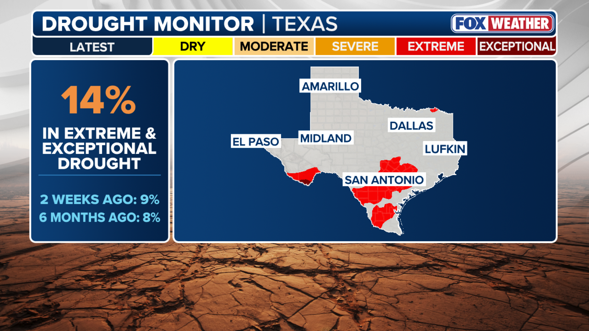 About 14% of the state is experiencing either extreme or exceptional drought – the two highest levels on the monitor’s scale.