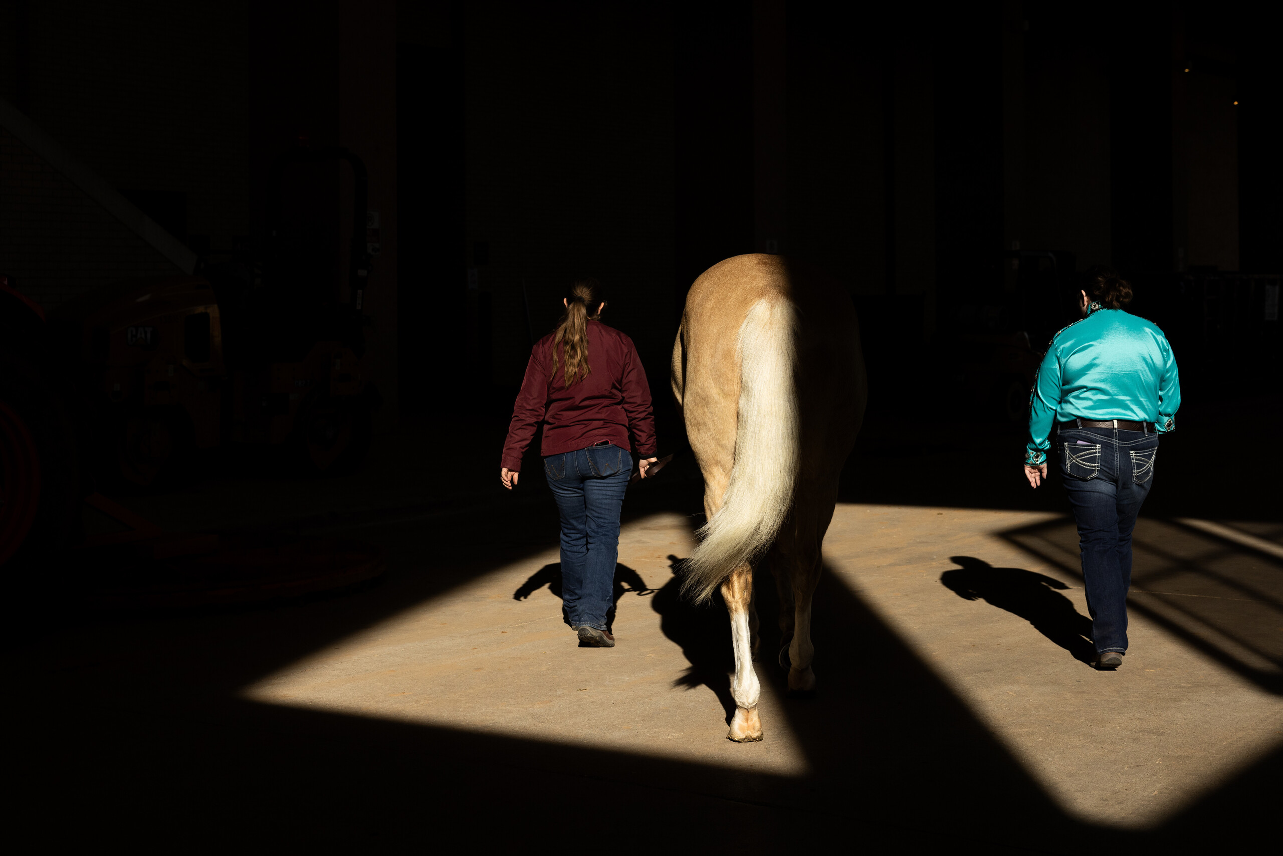 Tracy McCarty, AP, and Jasmin Moore walk toward the arena during the Chisholm Challenge in Fort Worth on Jan. 13. McCarty is the coach for Born 2 Be, a therapeutic riding and carriage driving program. (Maria Crane | Fort Worth Report/CatchLight Local/Report for America)