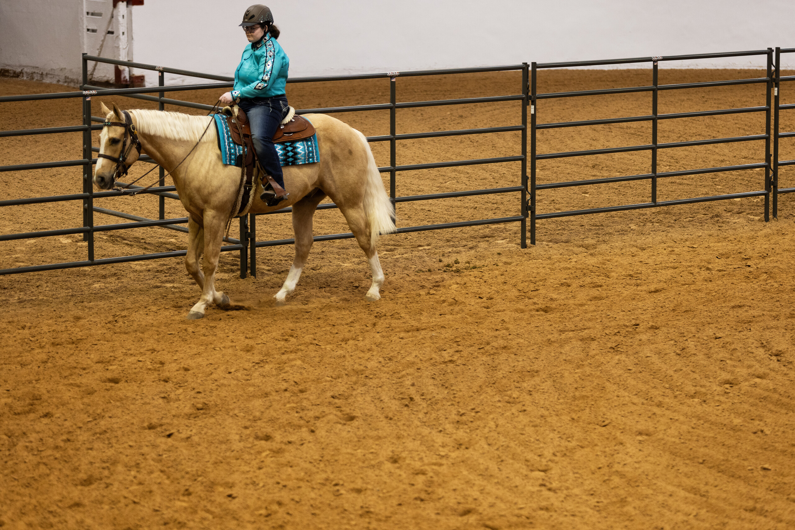 Jasmin Moore and AP compete in the Western Equitation at the Chisholm Challenge in Fort Worth on Jan. 13. Moore was judged based on her ability to communicate with AP, doing various transitions and movements. Moore took third place this year. (Maria Crane | Fort Worth Report/CatchLight Local/Report for America)