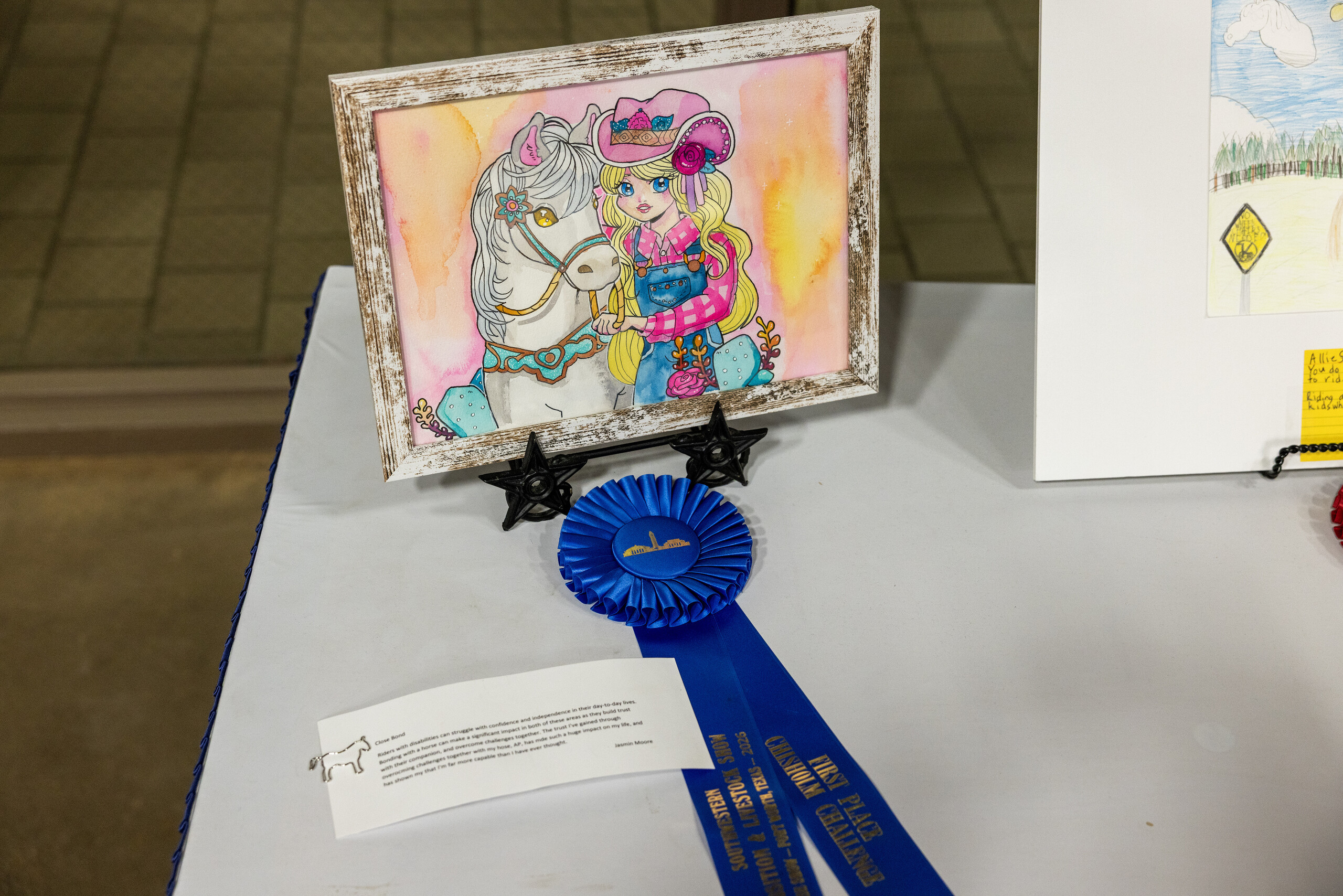 This year, she won first place for her entry titled “Close Bond.” The vibrant water color painting depicts a cartoon of a girl and a horse, visualizing her bond with AP. In her description of her art piece, Moore wrote, “The trust I’ve gained through overcoming challenges with my horse, AP, has made such a huge impact on my life, and has shown me that I’m far more capable than I have ever thought.”