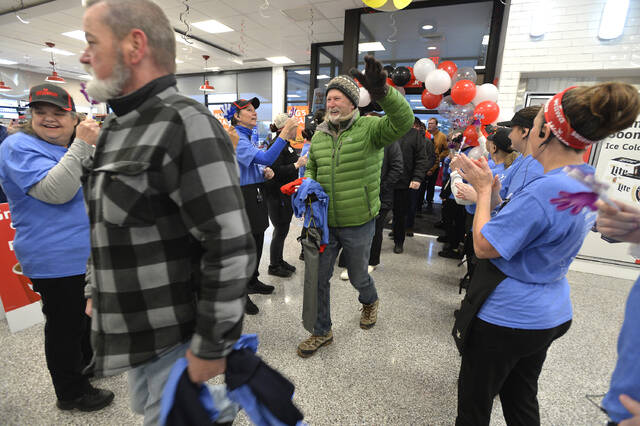 People walk through a greeting line at the Wawa in Dallas Twp. on Thursday morning.