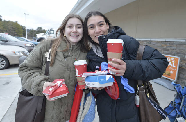 Abbie DeAnthony, left, and Emerson Sorber with their shirts, coffee, and other prizes at the new Wawa in Dallas Township.