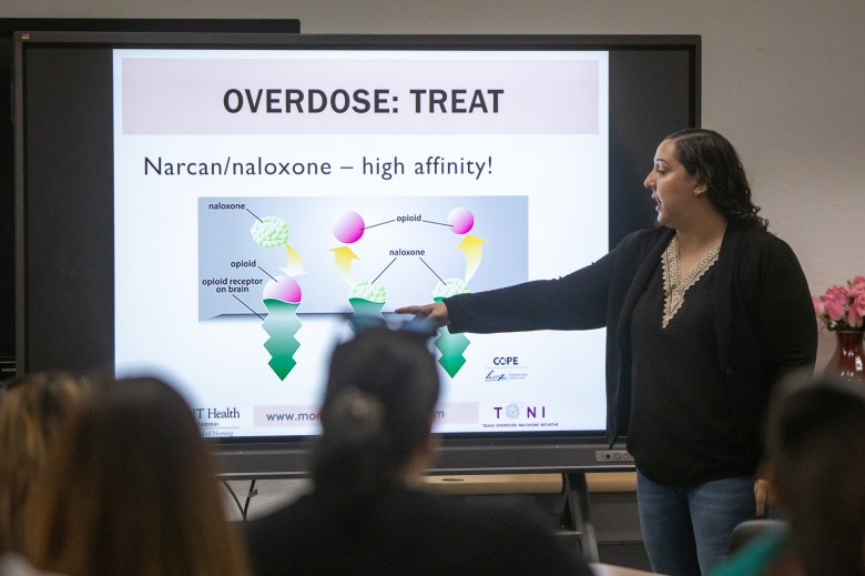 Michelle Millen of Aliviane explains how Narcan can reverse the effects of fentanyl overdose to Ysleta ISD employees during a training on using Narcan, May 6, 2024. (Corrie Boudreaux/El Paso Matters)