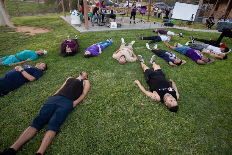Demonstrators lie on the ground to represent the 12 people who die each hour from drug overdose during the El Paso Harm Reduction Alliance’s event to mark International Overdose Awareness Day, Aug. 31, 2024. (Corrie Boudreaux/El Paso Matters)