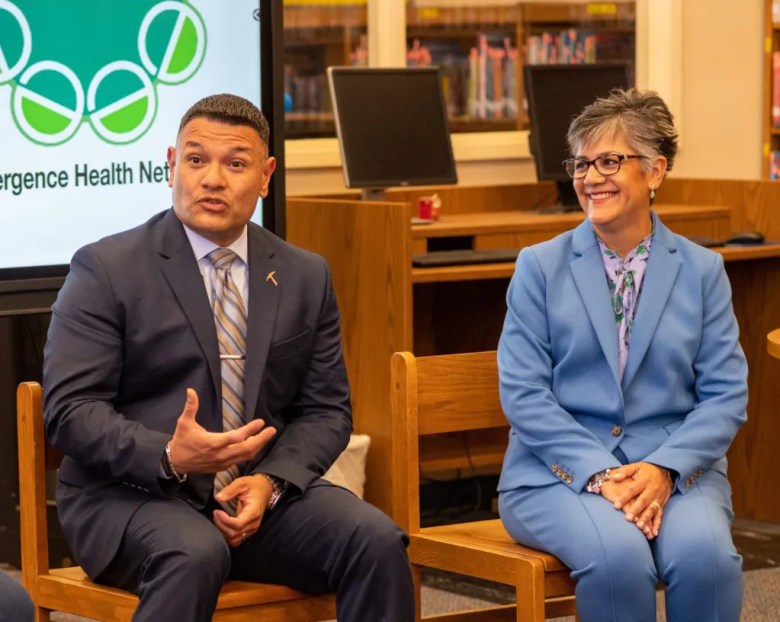 Fabens High School Principal Edgar Rincon and Superintendent Veronica Vijil speak about the district’s partnership with Emergence Health Network. (Courtesy of Fabens ISD)