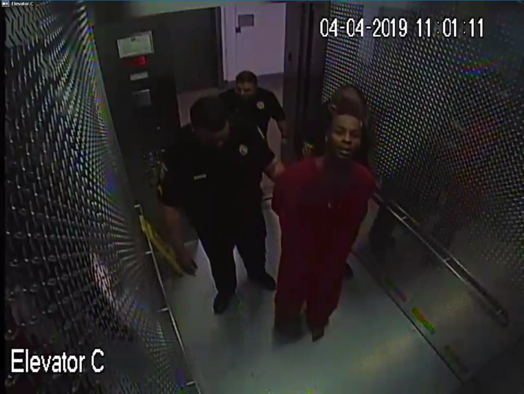 Tarrant County Jail security footage obtained through a public records request shows jailers escorting Derick Wynn to his first court appearance on Apr. 4, 2019. Less than an hour later, he would be unresponsive and on his way to the hospital after an altercation with jailers where one knelt on his back, according to investigation records. (Screenshot / Tarrant County Jail)