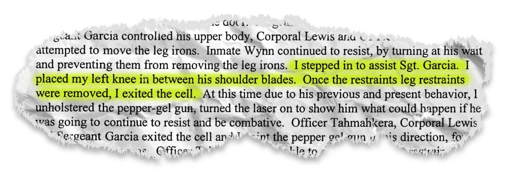 Of all the reports, only Garcia and Kelsey himself mention that Kelsey knelt on Wynn. Other jailers say Kelsey helped restrain Wynn’s upper body, or they don’t mention Kelsey at all.
