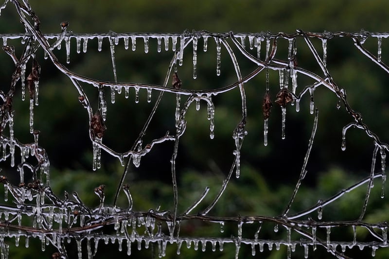Icicles cling to some vines along a barbed wire fence at an ornamental plant business in sub-freezing temperatures Friday, Jan. 16, 2026, in Plant City, Fla. (AP Photo/Chris O’Meara)