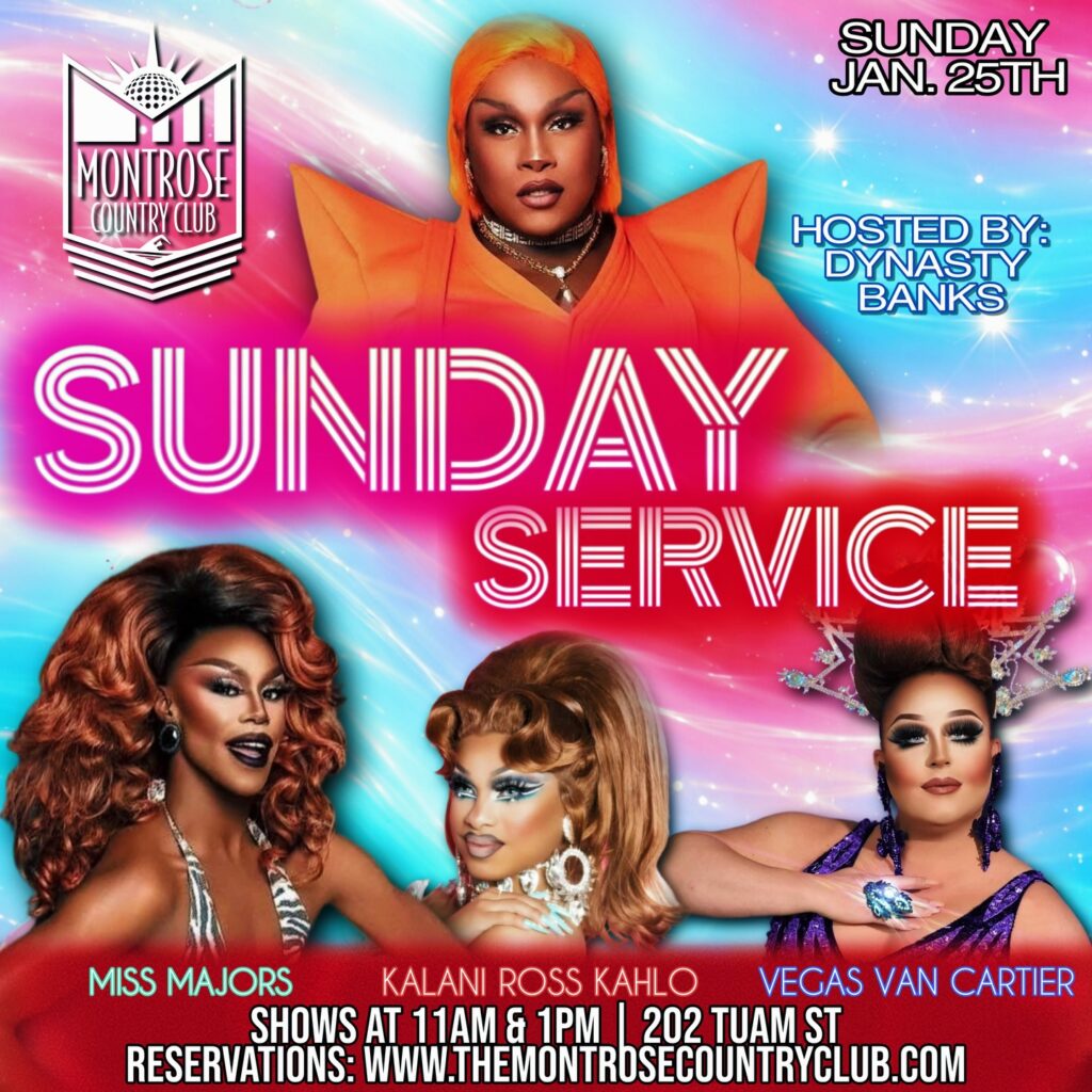 The Montrose Country Club presents Sunday Service Drag Brunch. This week, Dynasty Banks hosts shows featuring spectacular performances from Miss Majors, Kalani Ross Kahlo, and Vegas Van Cartier. 202 Tuam St. Shows at 11 a.m. and 1 p.m.