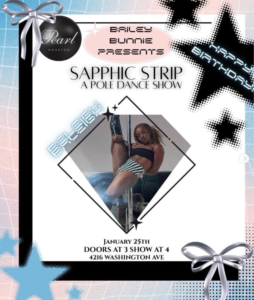 Pearl bar presents Sapphic Strip, a pole dance show hosted by Bailey Bunnie with performances by Star Vitamin, Karolina, and Mr. Bobert. 4216 Washington Ave. 3 p.m.