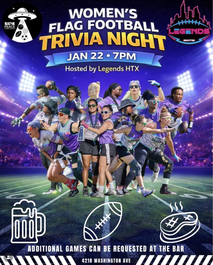 Pearl Side Peace and Legends HTX present a night of Women’s Flag Football trivia. 4218 Washington Ave. 7 p.m.