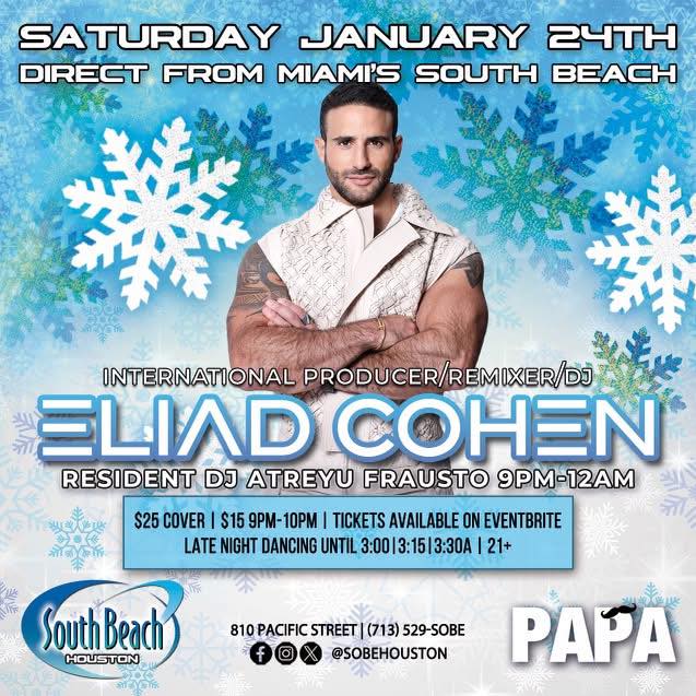 International superstar Producer/DJ Eliad Cohen returns to South Beach Houston. Resident DJ Atreyu Frausto opens at 9 p.m. 810 Pacific St. Midnight.
