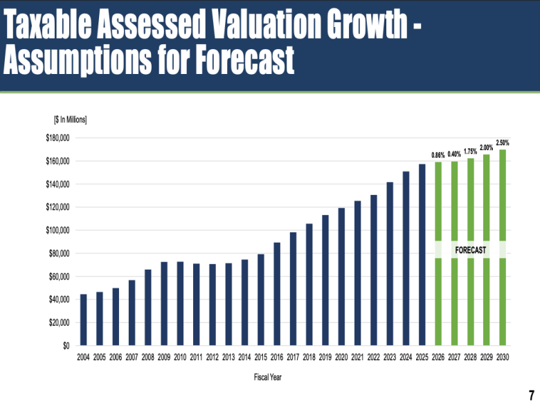The growth forecast largely matched what they knew going into the project last summer, with property tax revenue increasing by less than 1% from fiscal year 2025 to 2026, and an even smaller margin in the year after that.