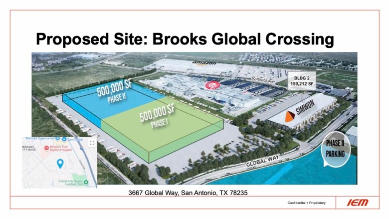 Proposed site for Industrial Electric Manufacturing’s Brooks facility from a Jan. 20, 2025 presentation to the Bexar County Commissioner’s Court. Credit: Courtesy / Bexar County