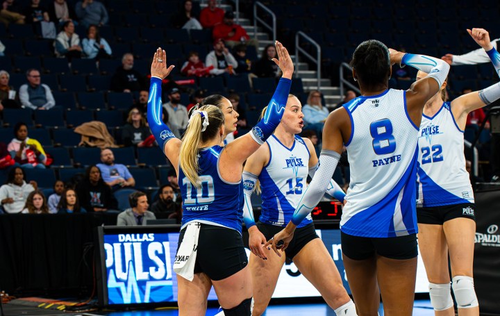Dallas Pulse players celebrate a point during a Major League Volleyball match on Thursday, Jan. 22, 2026 at Gas South Arena in Atlanta Georgia. (Photo courtesy of Major League Volleyball)