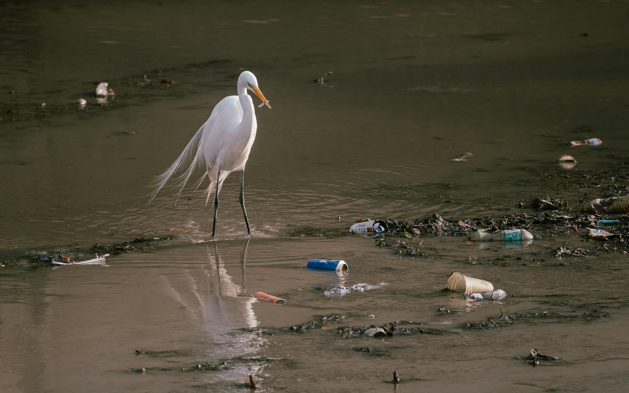 While the draining exposes a lot of trash, it also allows birds to more easily feast in the shallow water.