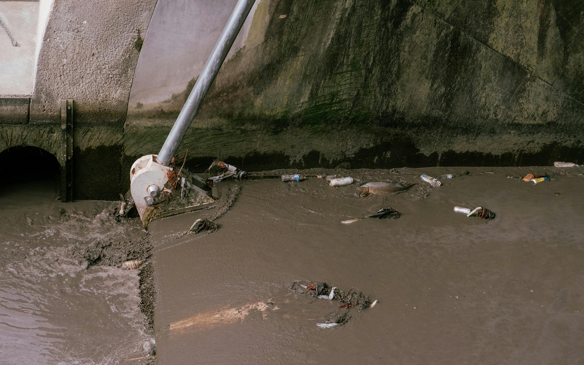A fish stranded among the trash at the Nueva Street dam.