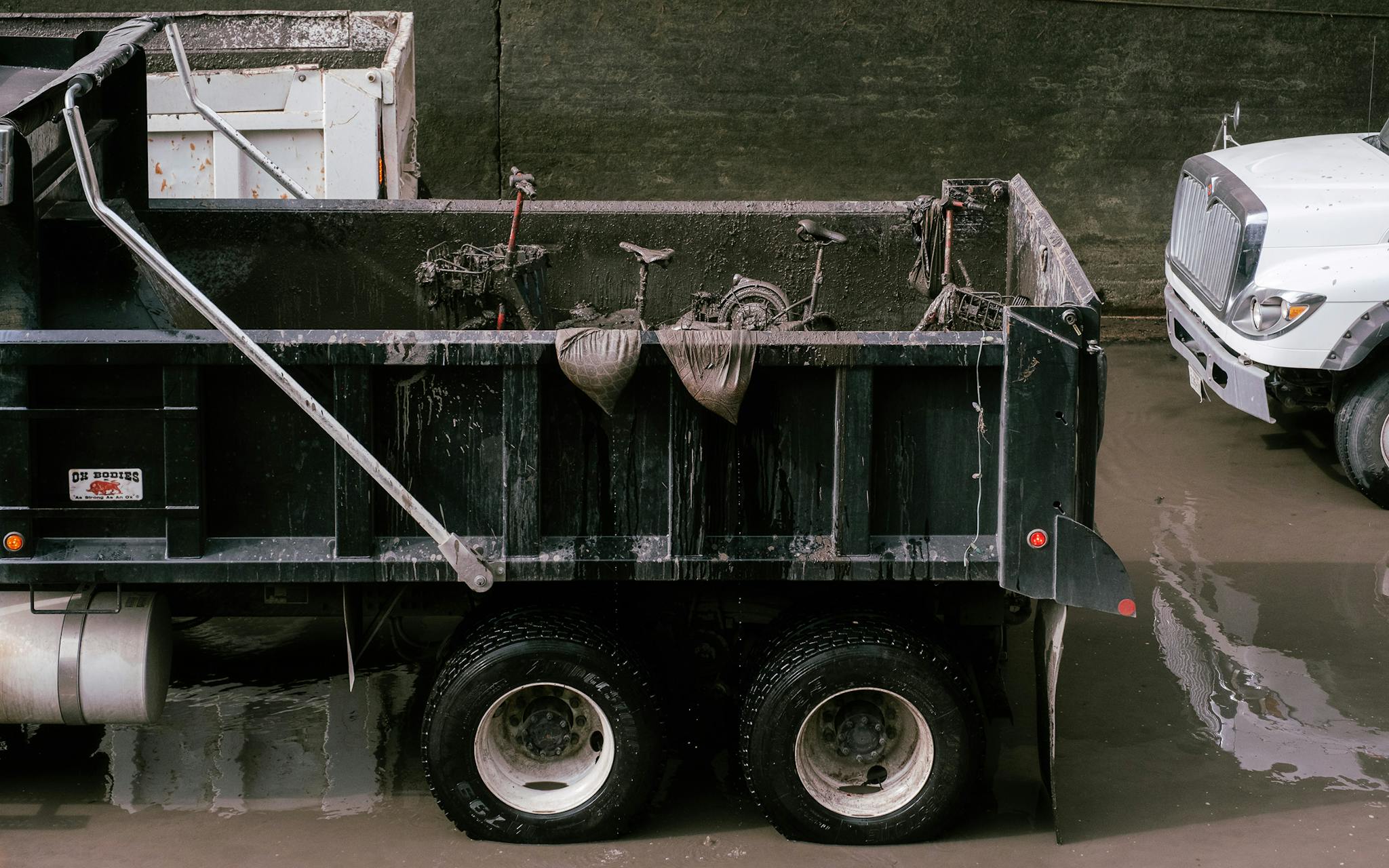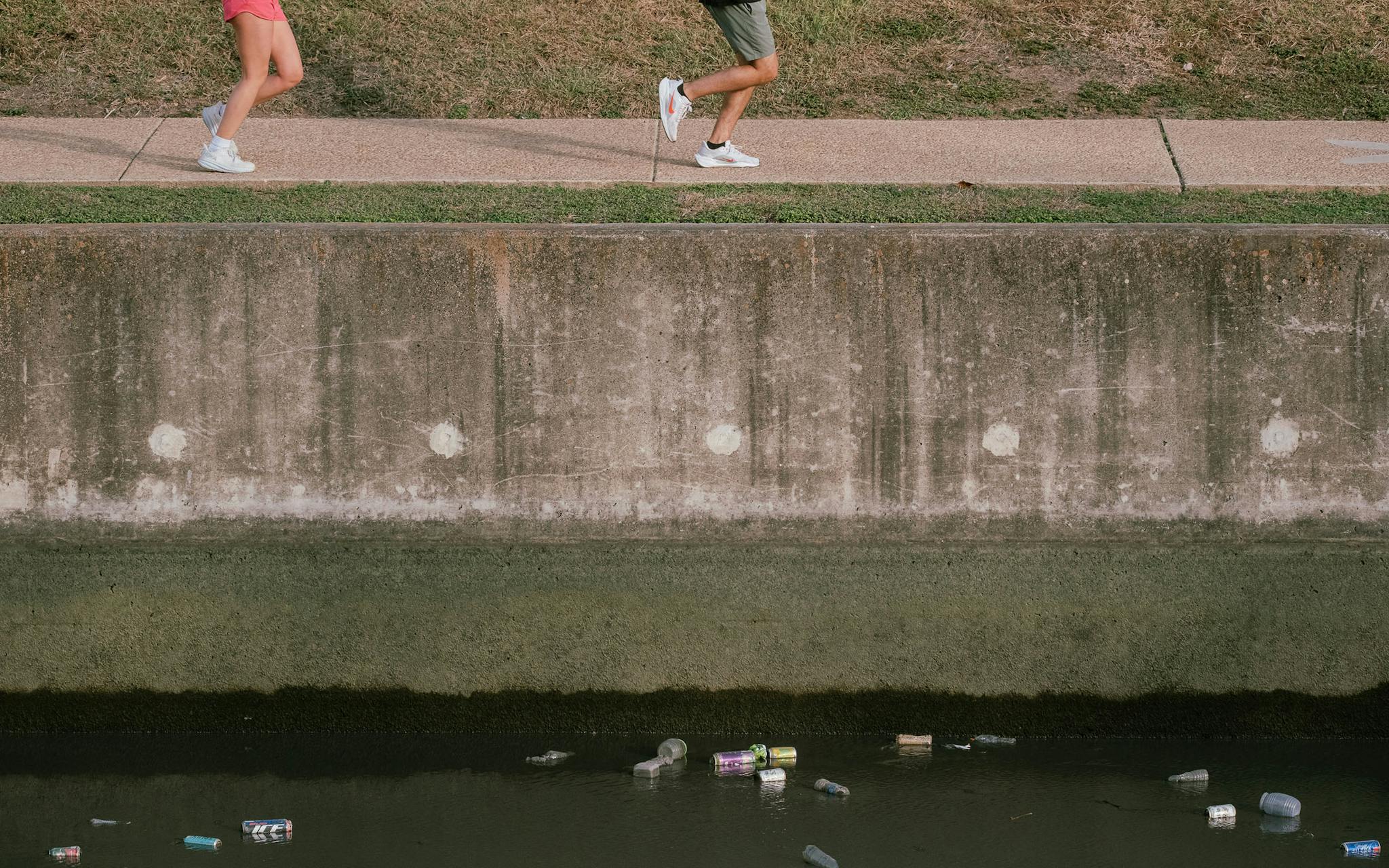 A pair of runners passing by exposed trash during the river draining.