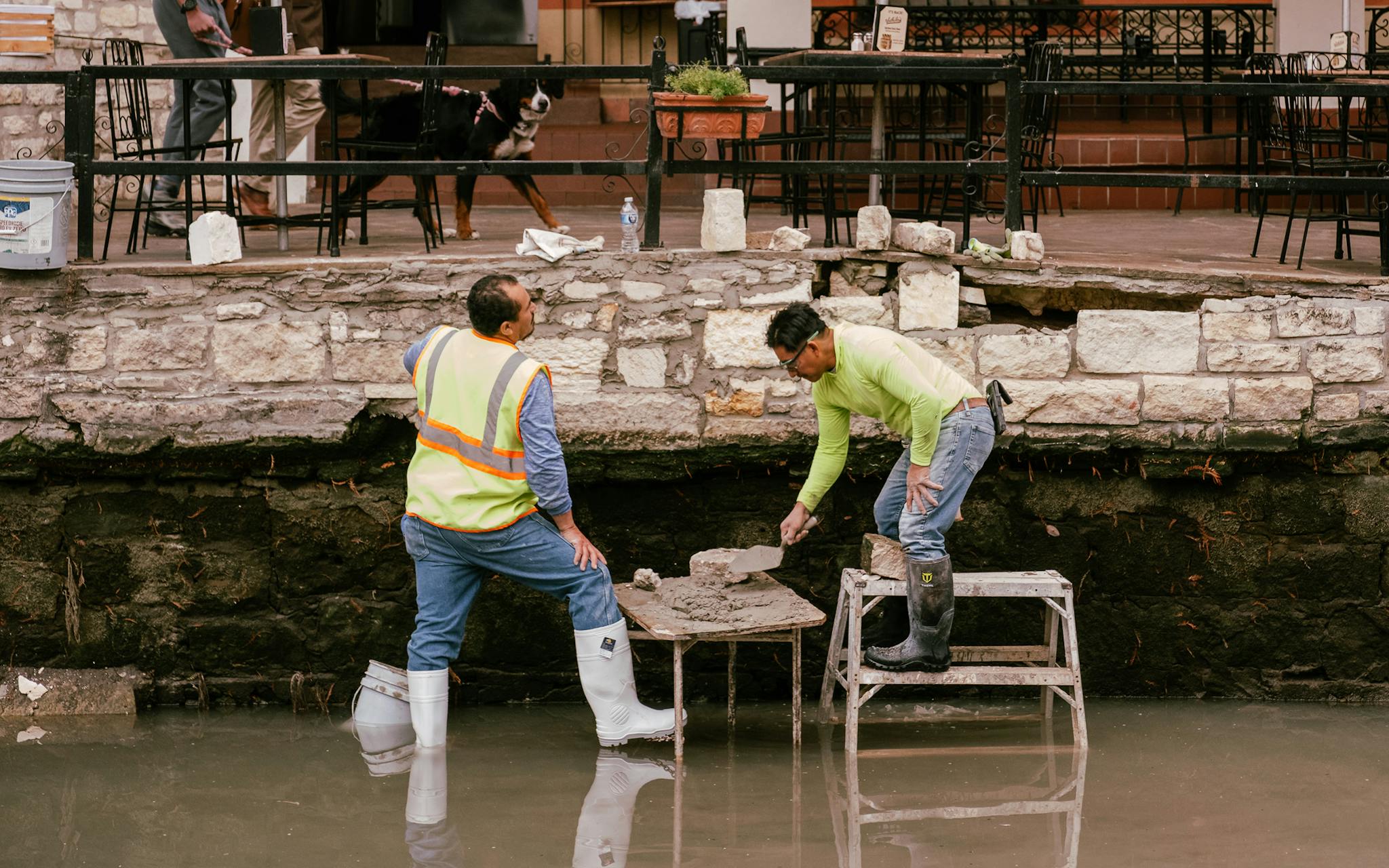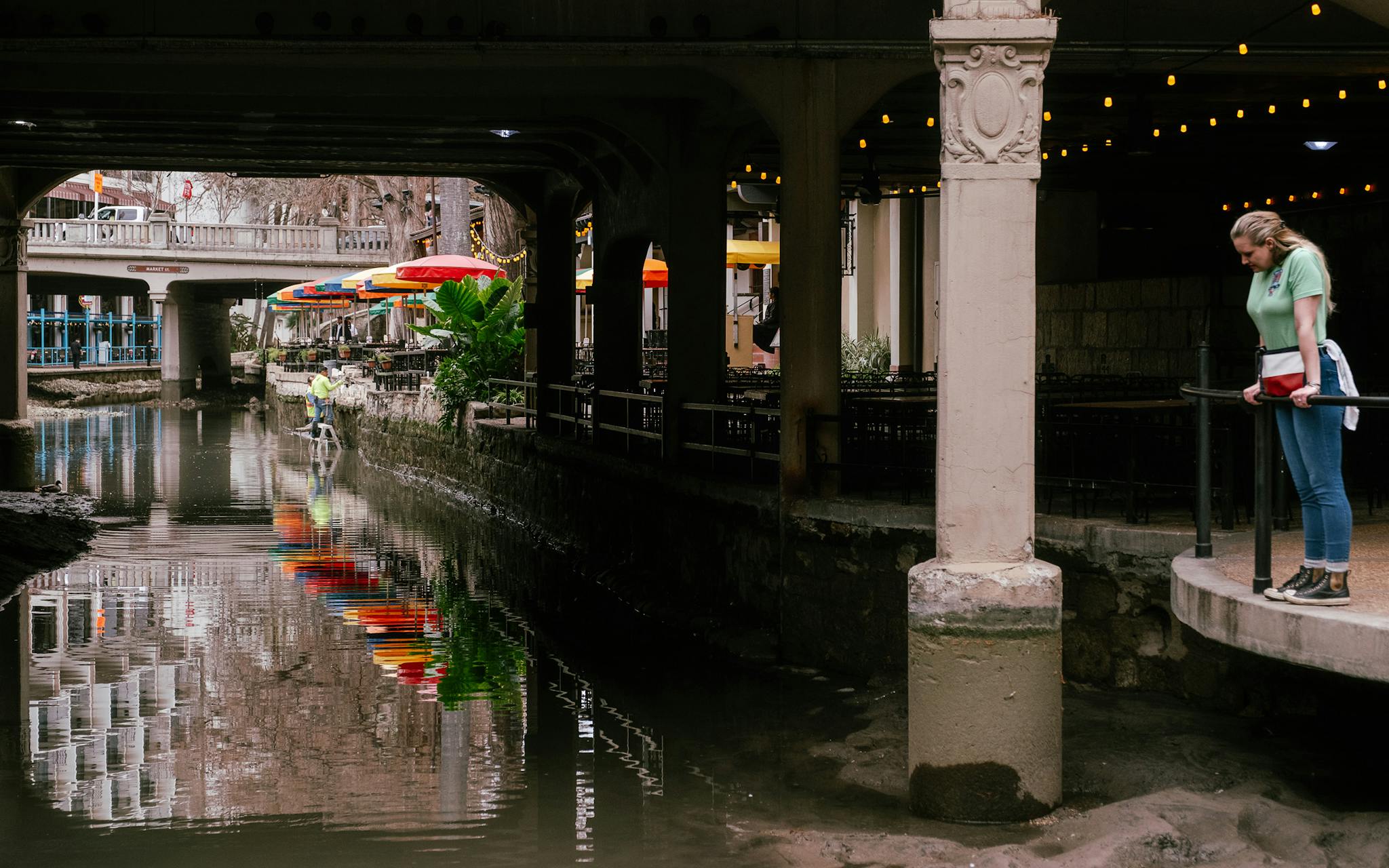 An employee of one of the River Walk restaurants looking down on the drained river while crews work on the walls downstream.