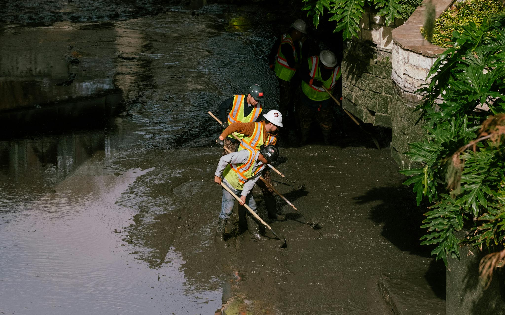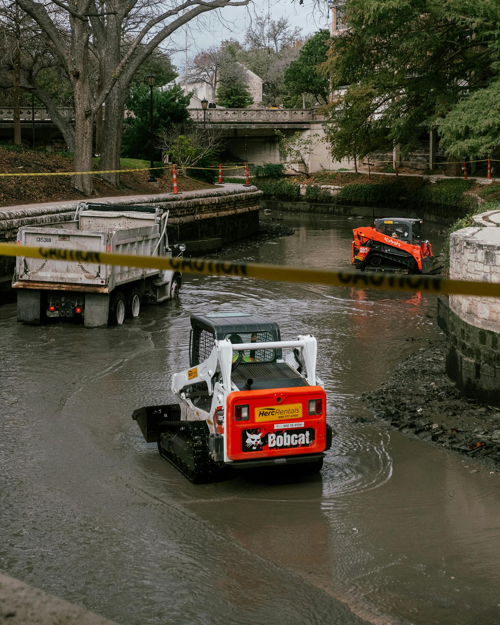 Public Works crews clearing sediment and debris from the downtown portion of the San Antonio River Walk.