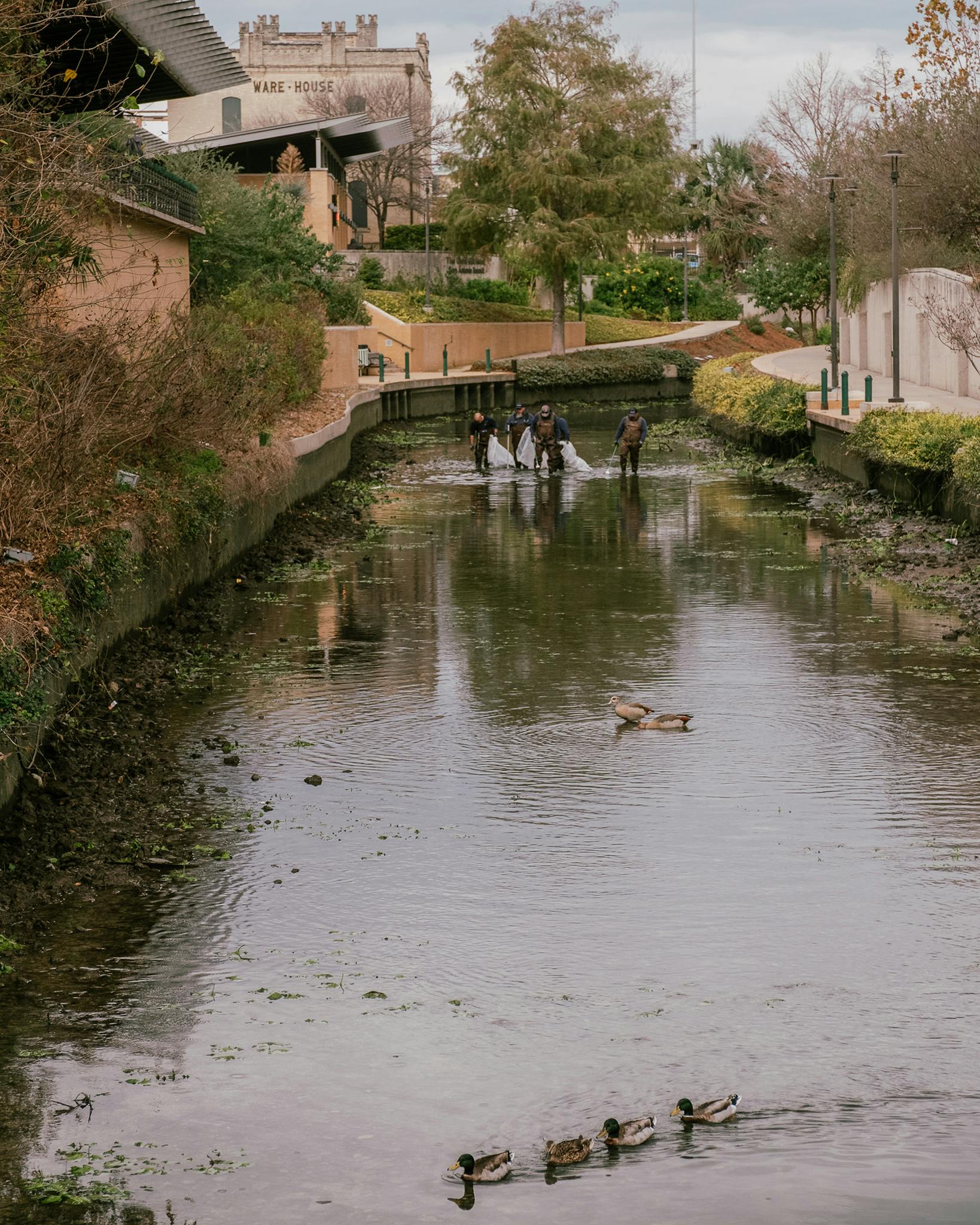 Members of the River Authority patrolling the Museum Reach area of the River Walk, collecting trash and debris while waterfowl forage in the shallow waters.