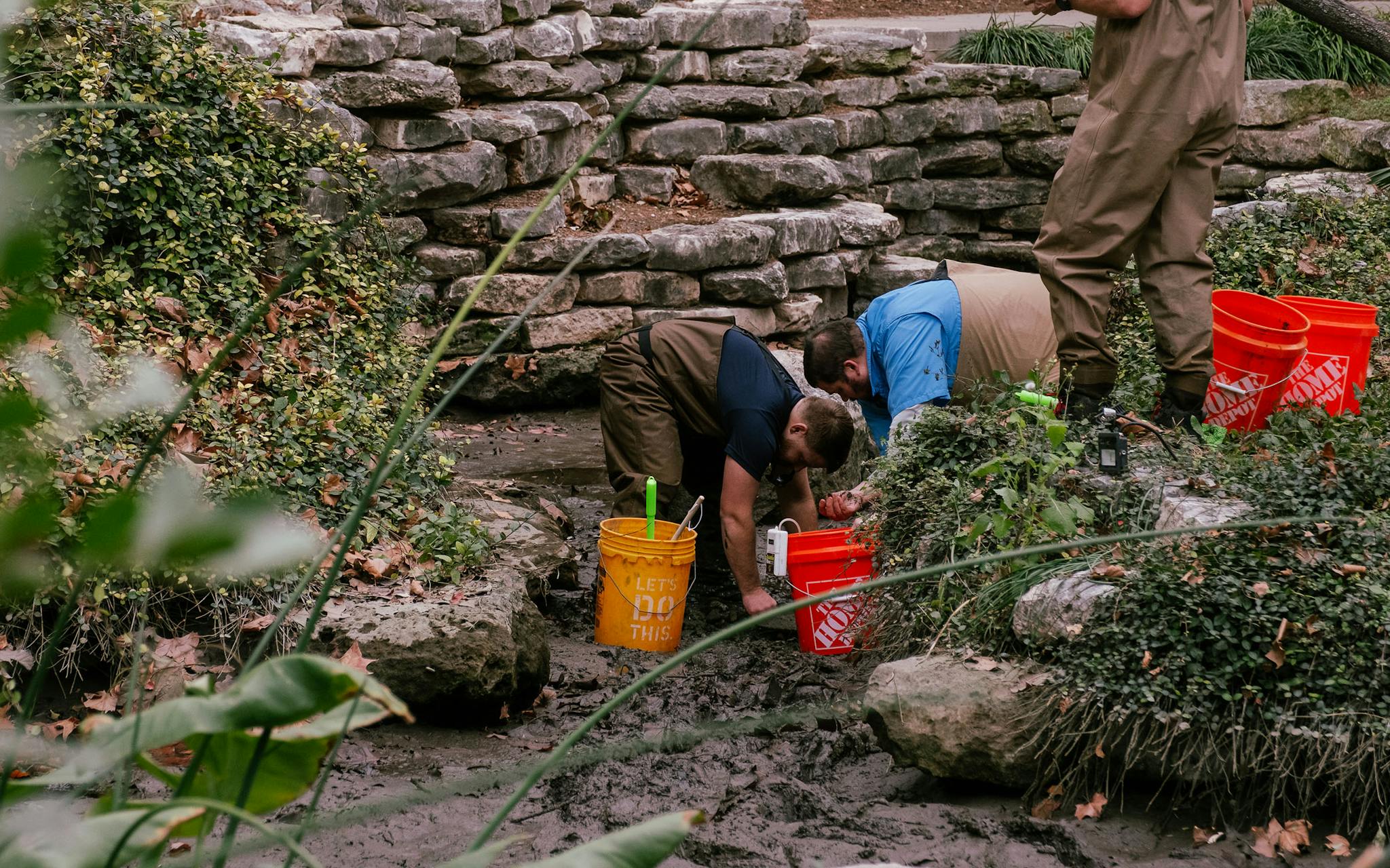 Aquatic biologists and experts from the San Antonio River Authority’s Environmental Sciences Department searching for fish stranded by the river draining. They are collected and held in aerated buckets until they can be moved to deeper waters.