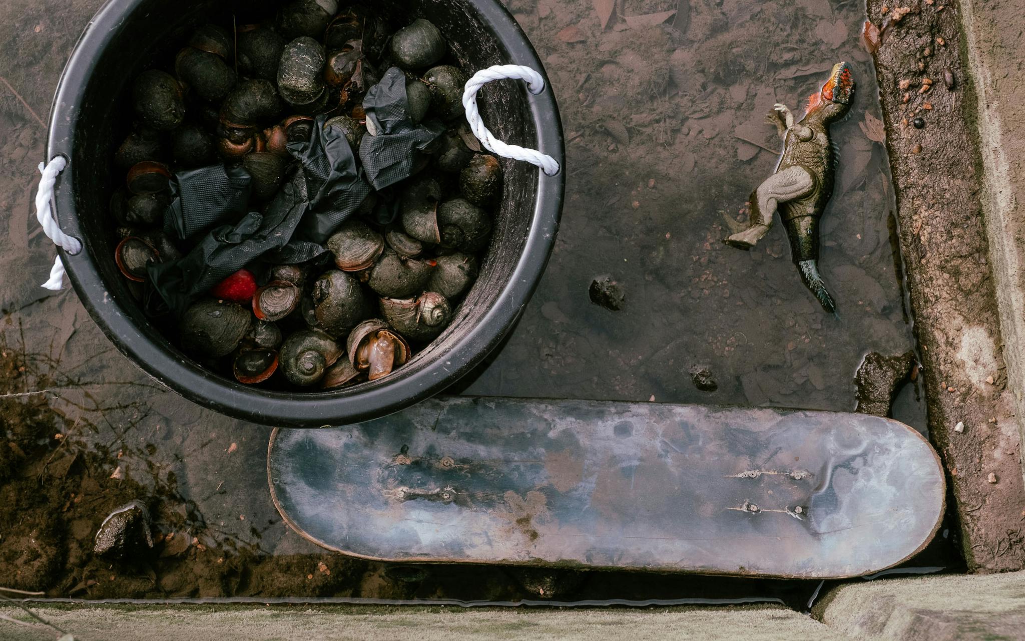 A toy dinosaur and a skateboard lying next to a bin of giant apple snails removed from the river.