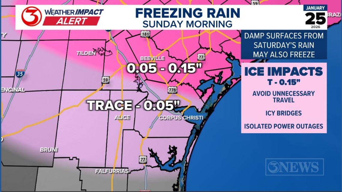 Freezing rain depends entirely on our surface temperature. Right now, it looks like most of the Coastal Bend will at least reach freezing breifly Sunday morning. We will also see another round of rain moving through the area Sunday morning. The timing is looking more favorable for freezing rain, but remember it has to be at least 32 degrees for the rain to freeze. No freeze means no freezing rain.Â