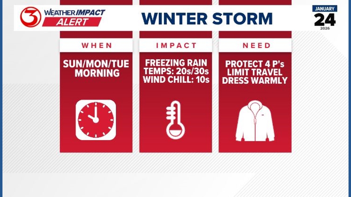 LOOKING AHEAD: The Weather Impact Alert shifts to the cold air. We will see the chance of freezing temperatures three nights in a row. with a hard freeze on Monday and Tuesday. The only day freezing rain is a possibility is on Sunday morning. And that is still a low chance. Â Make sure you take action to protect the four P’s (people, pets, pipes, and plants), limit travel on Sunday, and dress in warm layers if you go outside.