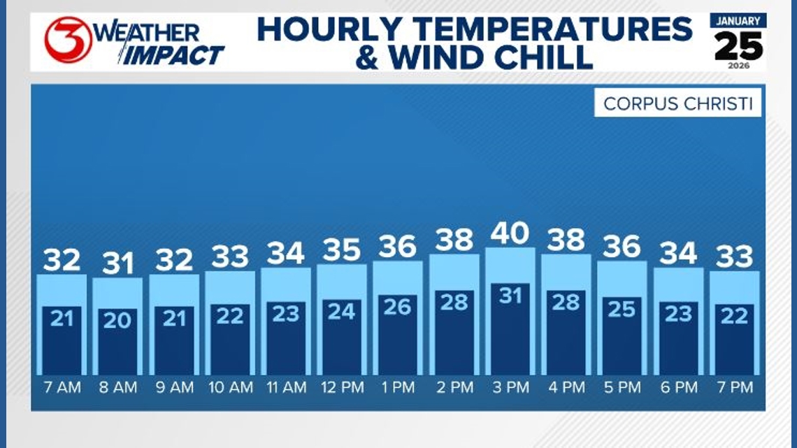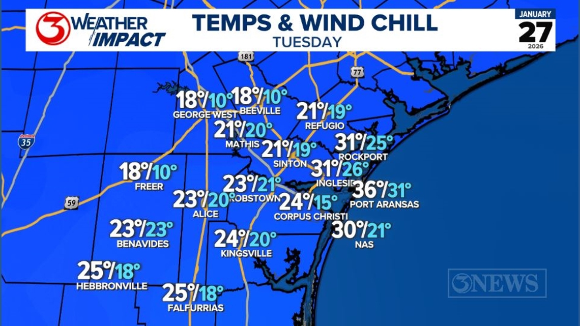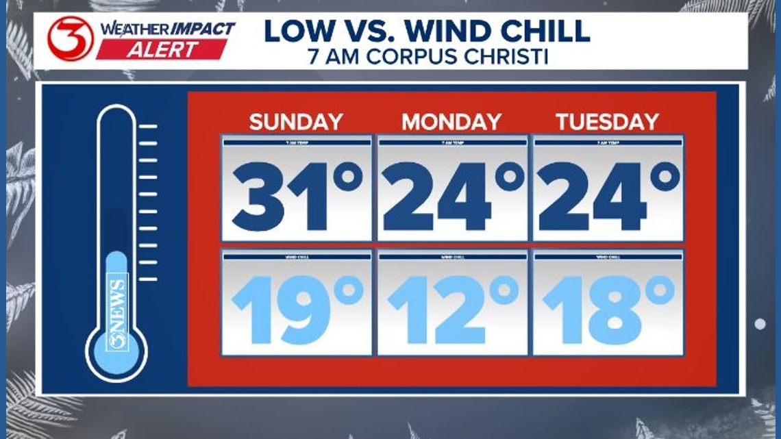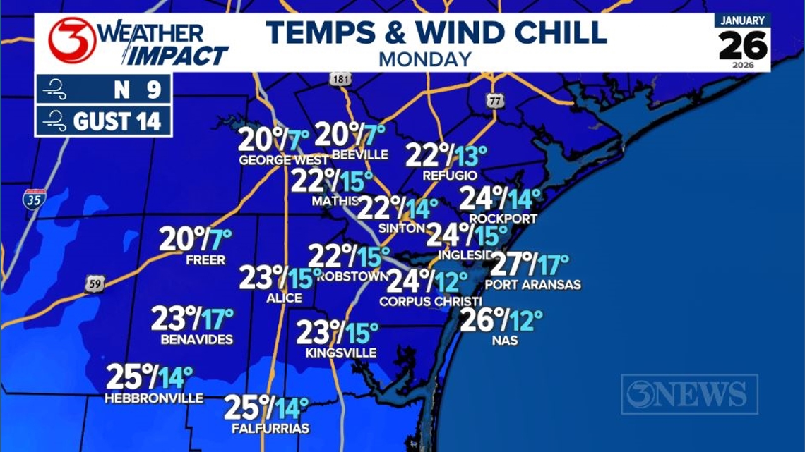 LOOKING AHEAD: Will likely be the coldest wind chills. Northern counties may see the wind chill fall into the single digits. Coprus Christi will likely be just above 10 degrees. Be ready for temperatures to be below freezing for at least 12 hours on Monday. A little shorter for the islands.Â