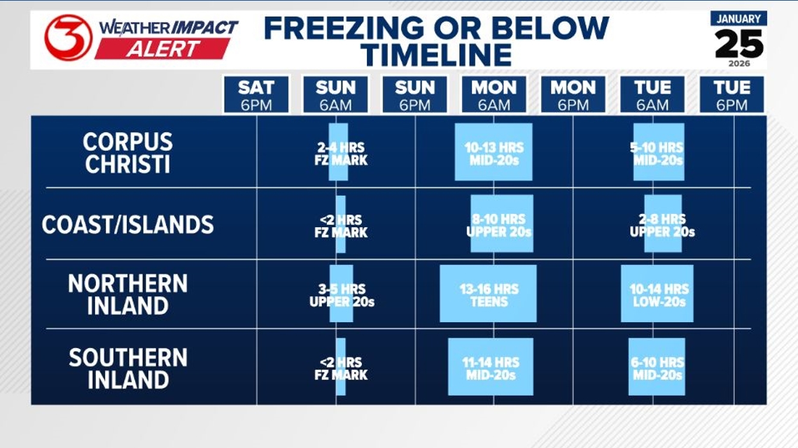The timeline below should give you an idea at how long we could see freezing temperatures across the Coastal Bend. Monday morning will be the coldest and longest freeze.