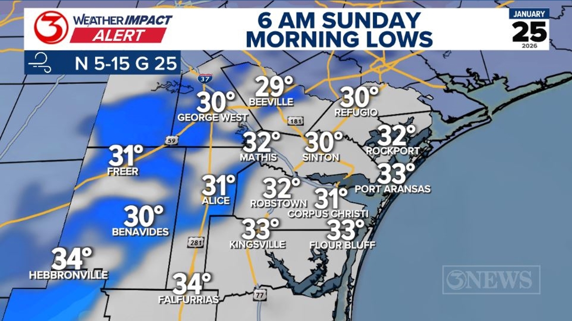 Our temperatures will be extra cold for the Coastal Bend. The northern counties are under an Extreme Cold Warning beginning at 9pm Saturday until 12pm Monday. The rest of the Coastal Bend is under a Cold Weather Advisory on Sunday morning, and an additional warning has been added on Monday from 3 AM to Noon. We may have one on Tuesday morning, too, but the wind will be lighter by then, so the wind chill may not be quite as cold.Â
