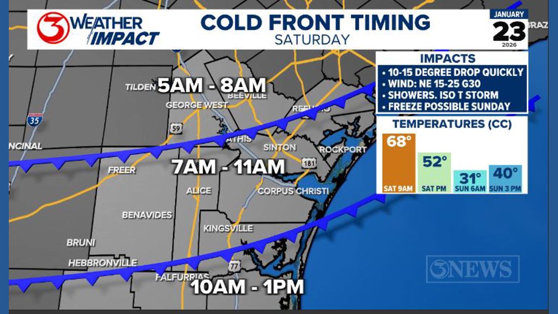 CORPUS CHRISTI, Texas — The Weather Impact Alert weekend starts now. The cold front will move through Beeville and George West around 6 AM and Ricardo and Sarita around Noon. The front may slow down a bit as it approaches the coast, but it’s booking it right now.Â