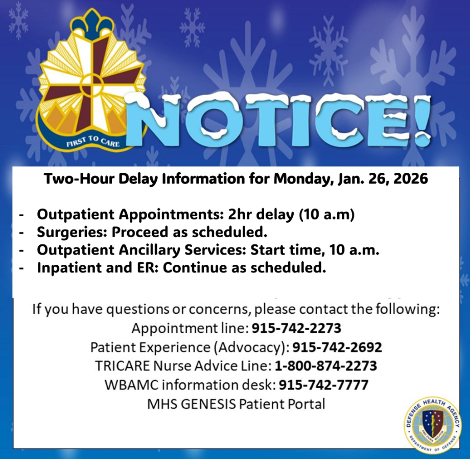 FORT BLISS, Texas (KVIA) – Outpatient medical services at William Beaumont Army Medical Center will begin at 10 a.m. The two-hour delay is to align with Fort Bliss’ inclement weather plan.