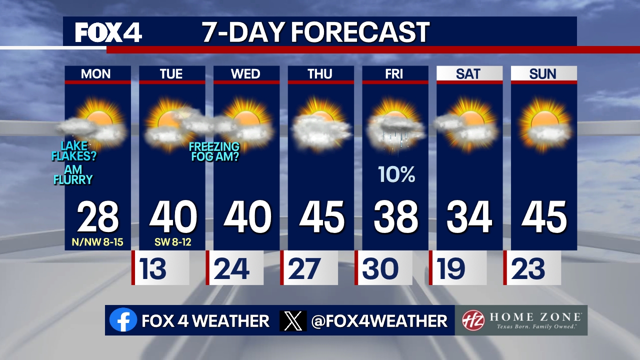 Wind chills at Dallas-Fort Worth International Airport were reported at 4 degrees Monday morning, with areas further north experiencing sub-zero feel-like temperatures. While regional radar remained clear, “lake effect” snow flurries were reported near Eagle Mountain Lake, Lake Bridgeport, and Ray Roberts Lake due to lingering moisture over the water.
