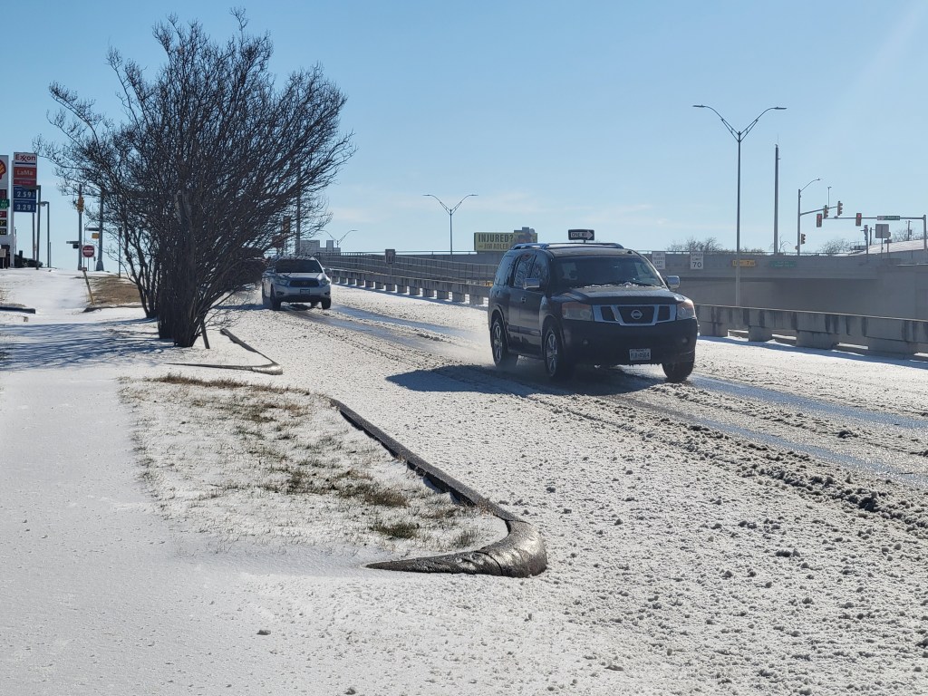 Cars travel down the Interstate 35W frontage road north of Allen Avenue on Monday afternoon. Melted ice was expected to refreeze for Tuesday morning. (Eric E. Garcia | Fort Worth Report)