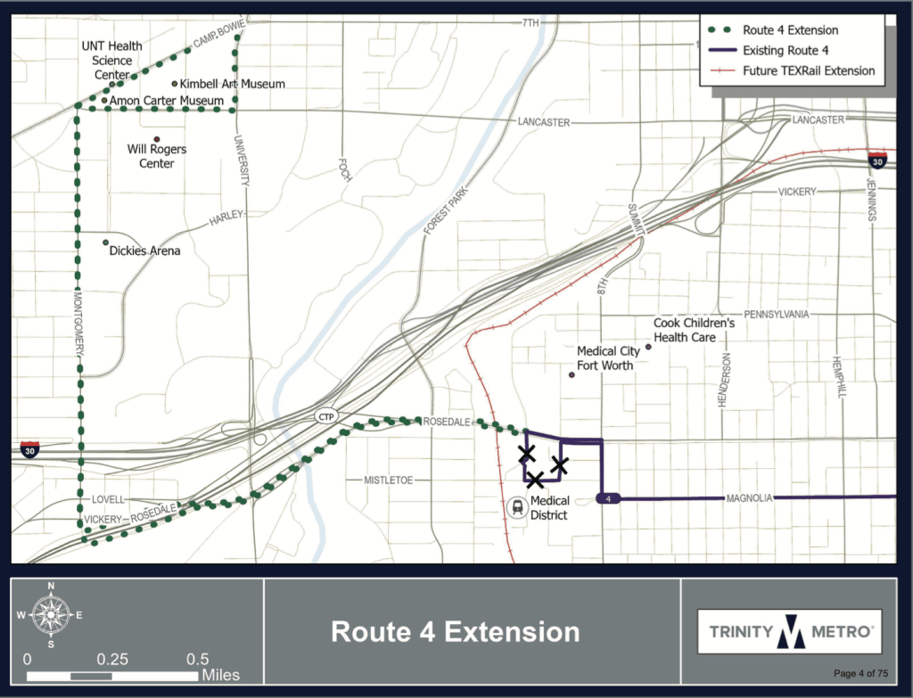With the extension, Route 4 will continue west on West Rosedale and cross under the Chisholm Trail Parkway and Interstate 30 to Montgomery Street. The bus would then head north, passing the Montgomery Street Antique Mall, Dickies Arena, National Cowgirl Museum and Hall of Fame, Fort Worth Museum of Science and History, the Amon G. Carter Museum of American Art and UNT Health Fort Worth before reaching Camp Bowie Boulevard. The route would also pass the Kimbell Art Museum and the Modern Art Museum of Fort Worth.