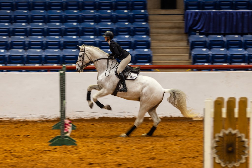TCU senior Lex Lipacis rides Billy during the jumping discipline at an equestrian meet at the Fort Worth Stock Show & Rodeo on Jan. 29, 2026. Jumping is an English riding discipline where riders navigate through a course of obstacles. (Maria Crane | Fort Worth Report/CatchLight Local/Report for America)
