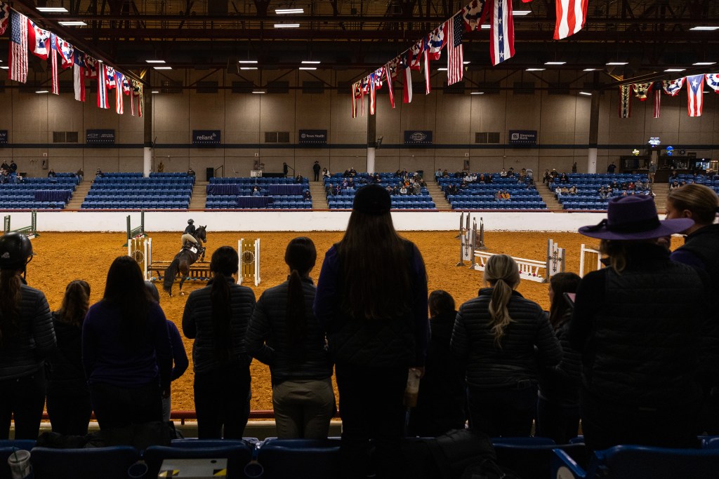 Teammates, family and fans watch Texas Christian University host the University of California, Davis, for an equestrian meet at the Fort Worth Stock Show & Rodeo on Jan. 29, 2026. Equestrians competed in jumping, flats, horsemanship and reining. (Maria Crane | Fort Worth Report/CatchLight Local/Report for America)