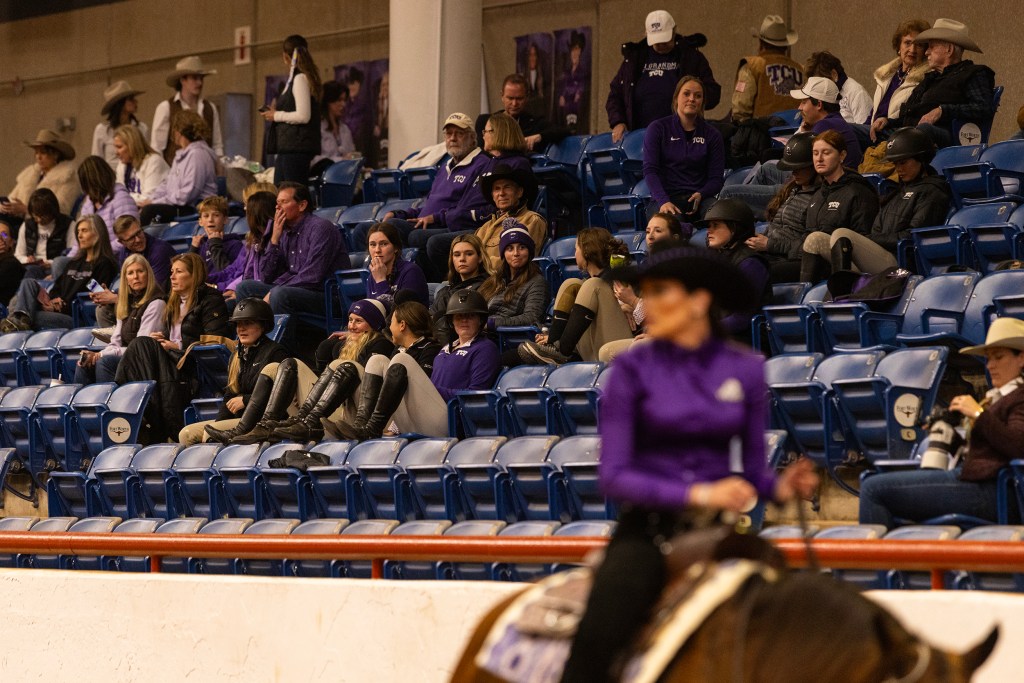 Purple-clad women stood side by side in the stands of the John Justin Arena, shouting with enthusiasm during Texas Christian University’s equestrian meet Thursday.