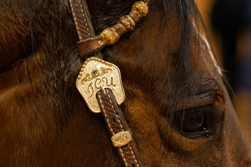 TCU horses have a branded bridle during an equestrian meet at the Fort Worth Stock Show & Rodeo on Jan. 29, 2026. (Maria Crane | Fort Worth Report/CatchLight Local/Report for America)