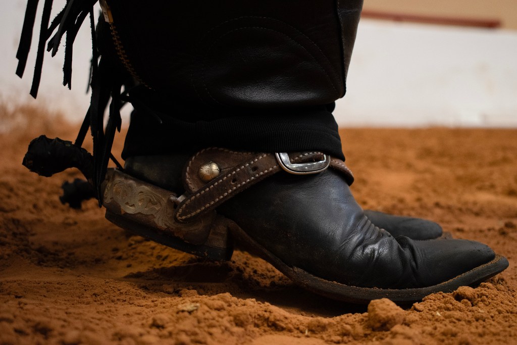 Sydney Feager, a Western rider for the TCU equestrian team, raises her right heel for a photograph of her boot on Jan. 29, 2026, in the John Justin Arena at the Fort Worth Stock Show & Rodeo. (McKinnon Rice | Fort Worth Report)