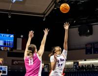Junior guard Jadyn Atchison, left, and junior center Jeanne Rodriguez cheer after UTA scores during a game against Utah Tech University on Feb. 5 at College Park Center. Atchison scored 16 points.
