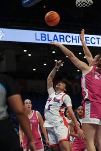 Freshman forward Kira Reynolds attempts a layup during a game against Utah Tech University on Feb. 5 at College Park Center. Reynolds scored 20 points.