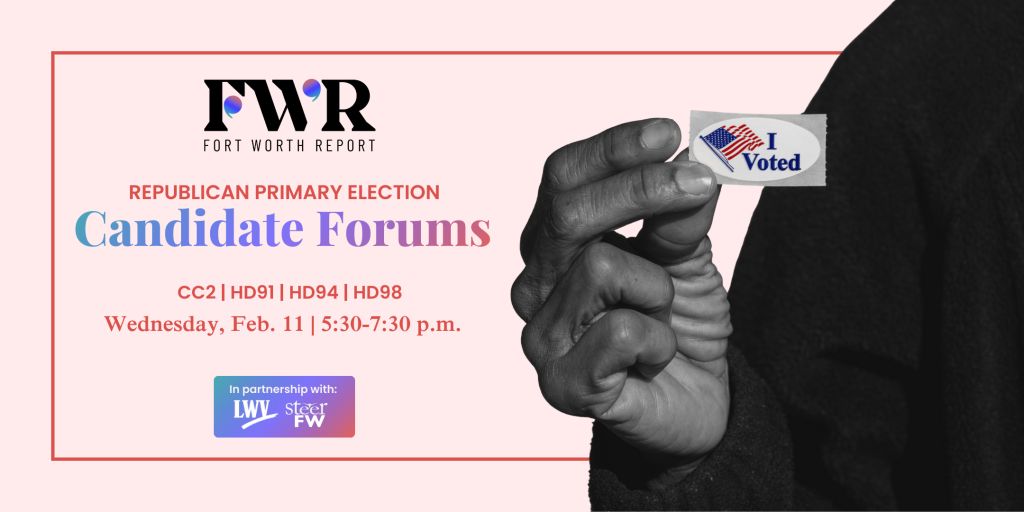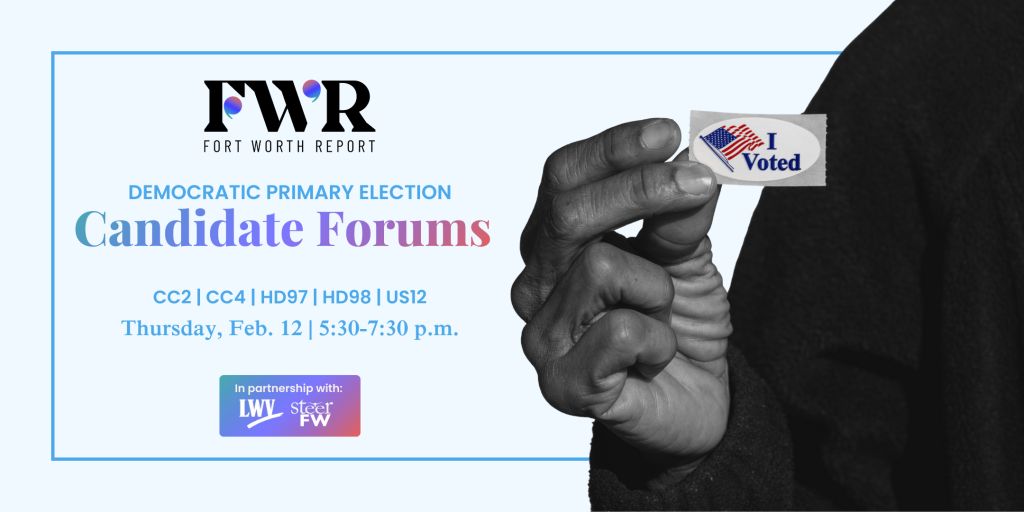 Debates for the Democratic Primary Election will take place at the same time and place on Feb. 12. RSVP to the second night of forums here. Fort Worth Report, SteerFW and the League of Women Voters are nonpartisan organizations.