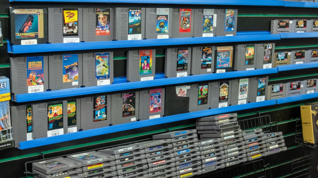 Game cartridges for the Nintendo Entertainment System on sale at Galactic Gamez in Fort Worth. Demand is still high for these games even though Nintendo has not supported the system since 1995. (Joseph Morgan | Fort Worth Report)
